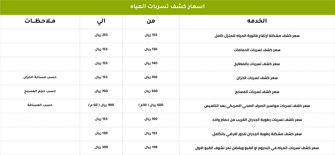 فنحن نقدم أسعار مثالية لأعمال الفحص الخاص بتسربات المياه التابعة من من الوصلة من عداد البلدية الي الخزان سواء كان هذا التسرب من الداخل أو الخارج ، كما أن هذه الاسعار تشمل تلك فحص تسربات خط البلدية التابع لشركة المياه عند مشكلة ارتفاع فاتورة المياه.